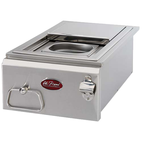 Keep ice in the outdoor kitchen cold with a drop-in 12 in. Cal Flame Stainless Steel Cooler and Cocktail Center. A single condiment tray can keep favorite garnishes chilled and fresh for guests. A towel rack and bottle opener makes tending bar a tidy task.