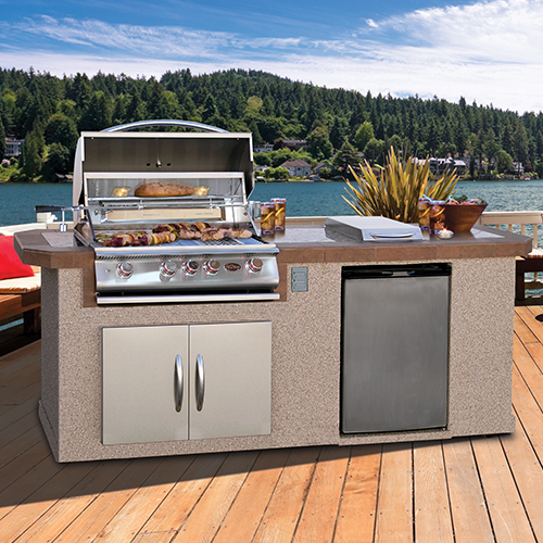 This BBK-801 has everything you need to grill with ease. The countertop has enough room for accessories and main dishes. It comes standard with a P4 Cal Flame Grill, stainless steel temperature controlled refrigerator, side burner, and outdoor electrical. The BBK-801 is built to give you everything you need.