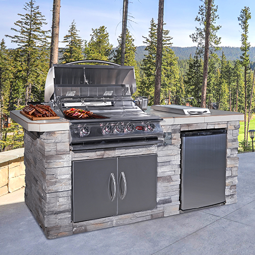 This sleek and simple design on the BBK-710 will enhance your outdoor living space to be true luxury. The countertop has enough room for accessories and main dishes. Equipped with a P4 Cal Flame Grill, refrigerator, side burner, electrical. Hide the propane tank in the centralized 30” double access doors located under the grill.